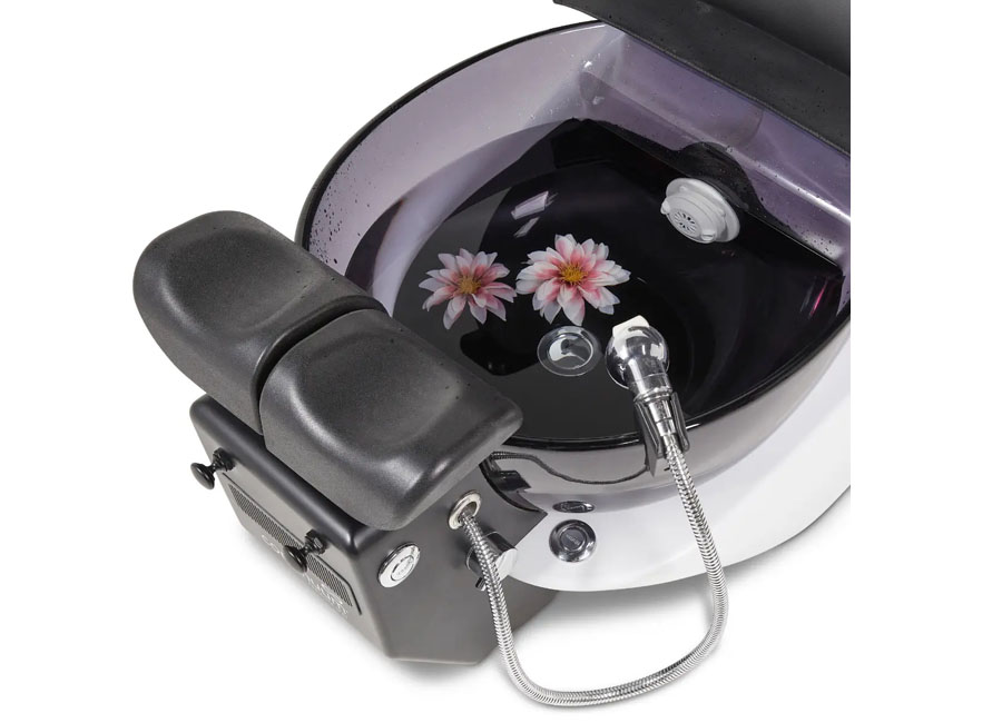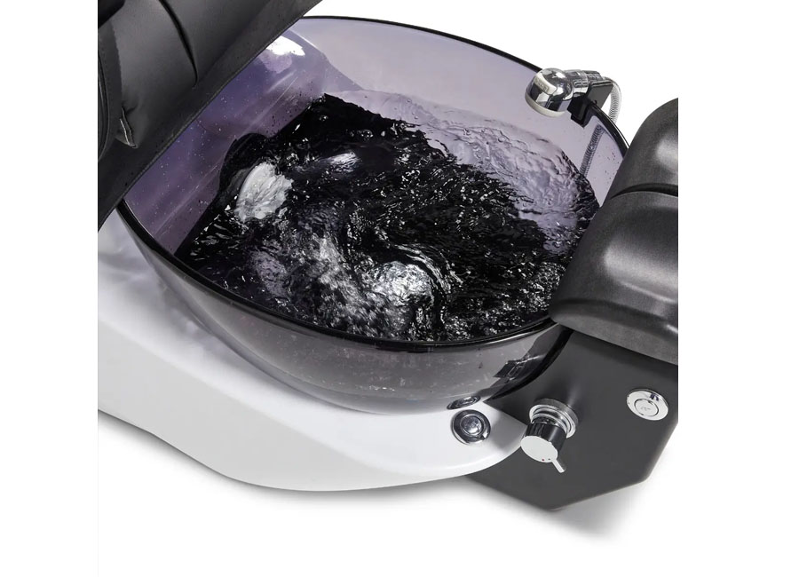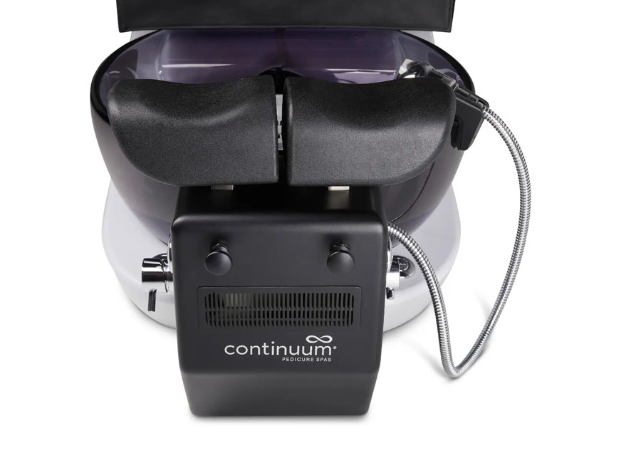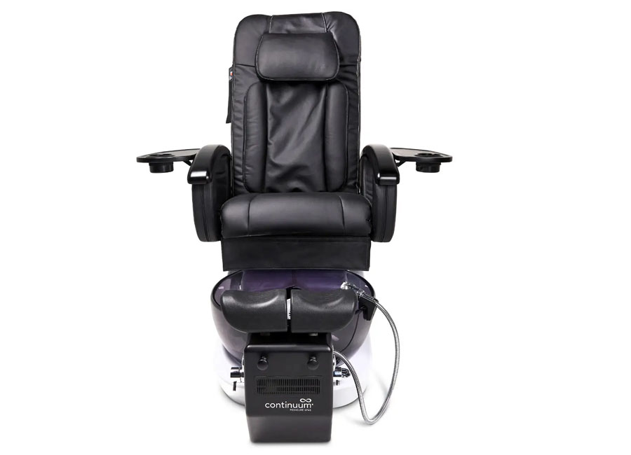 Clients are swaddled in a fully electric adjustable chair, hand upholstered in supple 100% PU leather, while enjoying full shiatsu massage. The eye-catching pedicure bowl sports the WhisperJet™ pipeless magnetic jet system. Independently adjustable footrests and a narrow, tapered front provide exceptional ergonomics for nail techs. This unit comes standard with acetone resistant flip-up side trays and our proprietary ventilation system. CE & UL listed. Backed with the industry’s best warranty, by Continuum, the industry’s premier manufacturer.