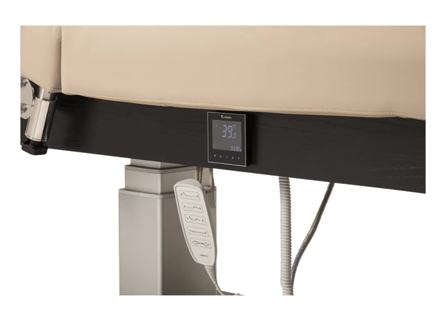 A standout feature of the Marut Spa Table is its integrated heated top, utilizing an IVC Technology Heater for consistent warmth. The programmable digital temperature controller displays real-time mattress temperature, ensuring guests receive soothing warmth throughout treatments.