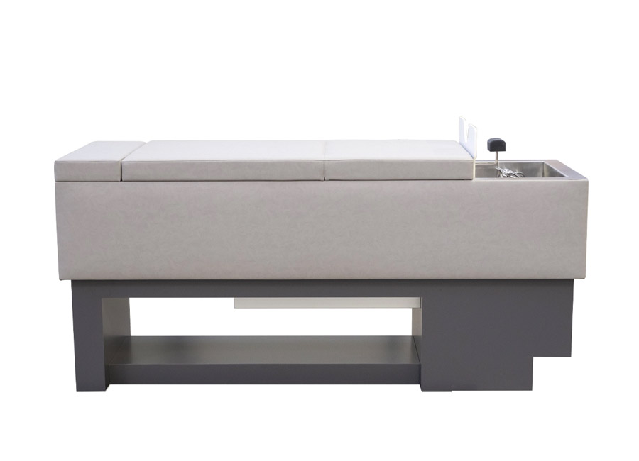 All-in-one electric shampoo Massage bed with Pedi Spa function. It can be used as massage table, shampoo station, hair spa treatments, and pedicure spa services. Electric lifting movements and backrest adjustments with remote control. Stainless steel basin. Silicone headrest cushion and footrest upholstered in vinyl. All vinyl colors available.