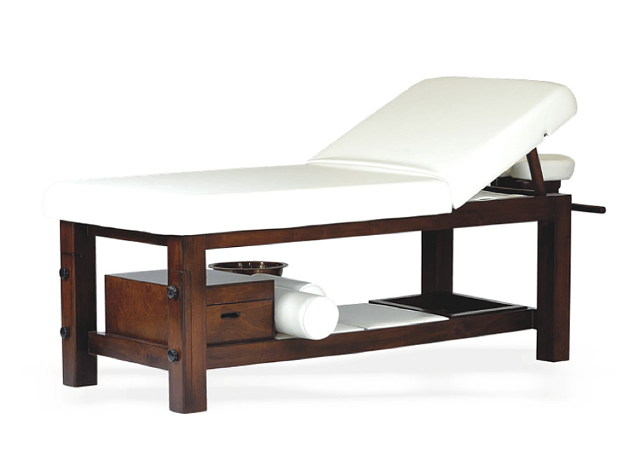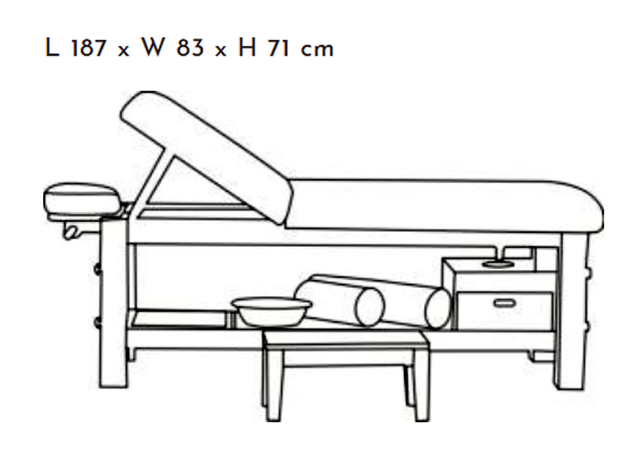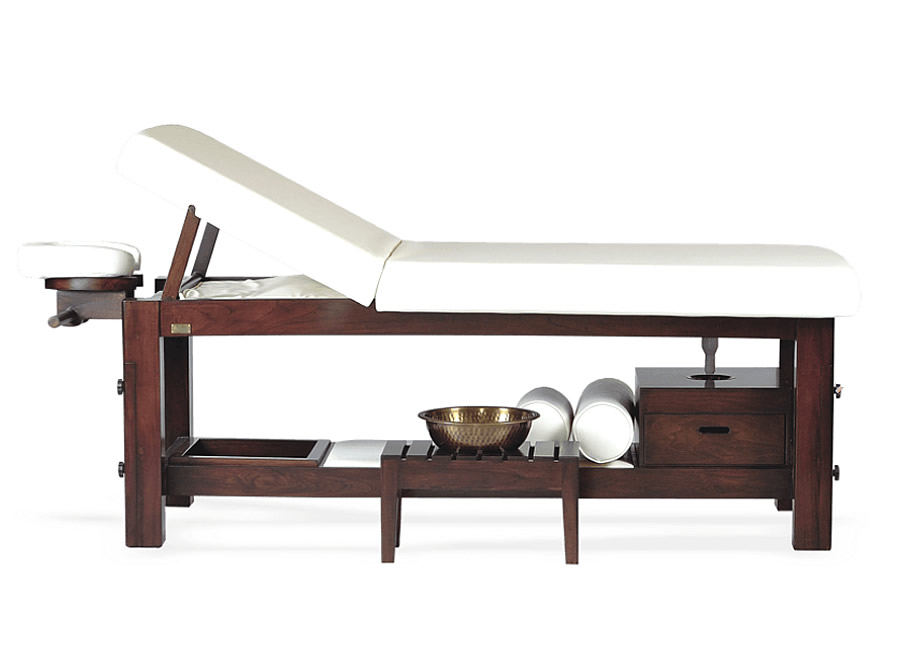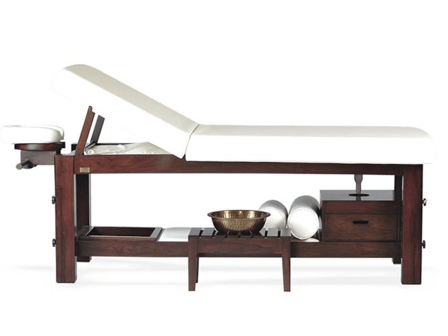 Shirodhara Massage Bed is multipurpose treatment bed suitable for both oil & dry massages. The top mattress is detachable and can be removed from the bed and kept on the floor for dry floor massages or stretching exercises. Crafted from solid teakwood this massage table is supplied with lot accessories that are used in massage therapies. The accessories include a wooden step to get on/off the bed for old and overweight clients, two bolsters, two brass bowls for oil pouring and oil collection purpose, a detachable wooden drawer, detachable wooden tray, a cushioned wooden headrest and wooden part to incline the backrest. This massage bed has manually adjustable height and the height can be adjusted. Rounded corner top cushion for easy movement during massage therapy.