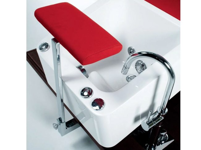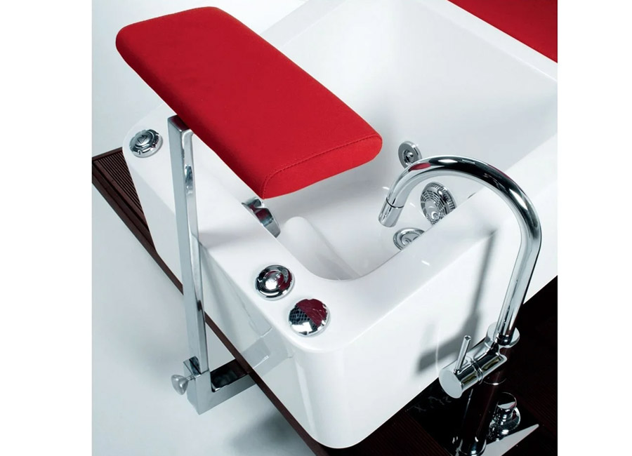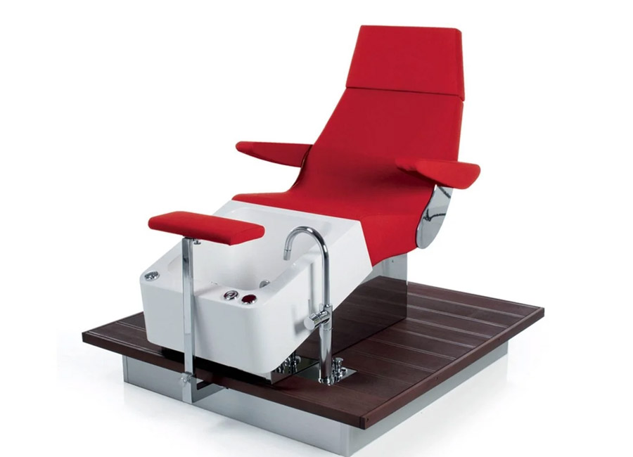 Pedicure with electrical reclining back and removable head rest, with air-shiatsu massage system plus hydro-massage jets system (silent). All vinyl colors available.