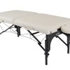 Standard Features: • Hourglass tapered shape, 30″ wide at the shoulder area and 26″ wide at the waist area. • Hoop frame design, 10-layer laminated hoop frame • 2 1/4″ – 2 layer lightweight foam system • Jointless™ rounded corners • Aircraft quality Russian Birch plywood decking • Full-length piano hinge • Telescoping legs for quick height changes w/Shimmy Lock • Mid-brace™ Cradle-lock Cabling System with 1,000 lbs test cables • Stitched Fit™ upholstery for a greater working surface. • Eco friendly VelveTouch™ Upholstery in 5 playful colors: Blush, Celeste, Jade, Midnight, and Plum • Dual headrest outlets • Non-slip feet • Stools and bolsters available in matching upholstery colors