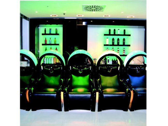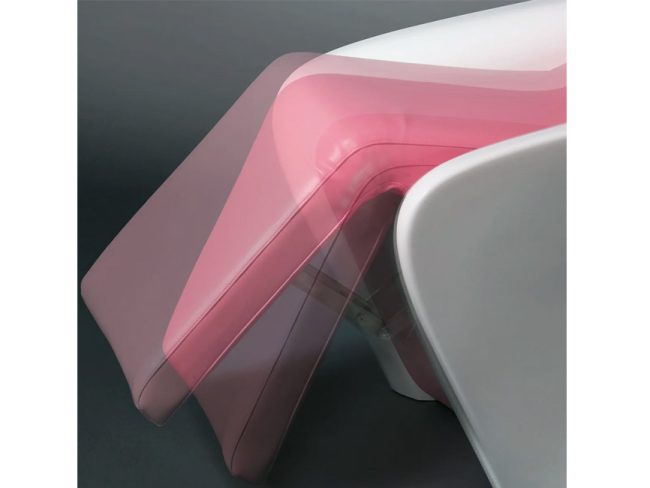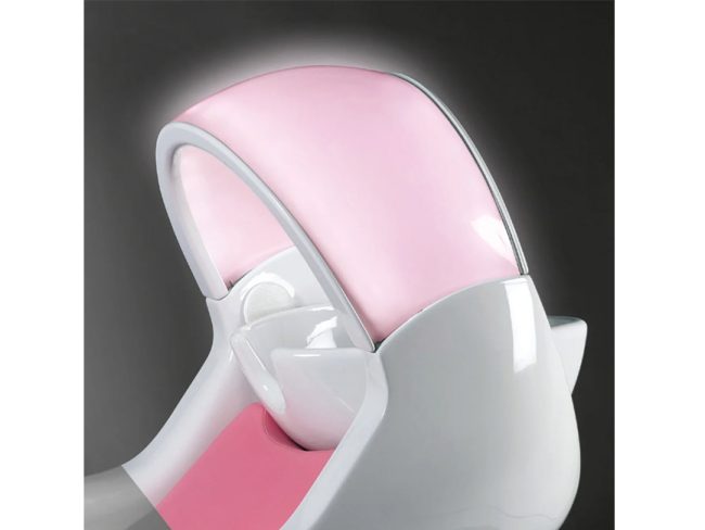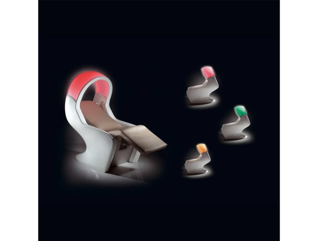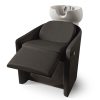 This backwash comes with a tilting and sliding bowl (available in white or black ceramic), synchronized electrical movement seat/backrest/legrest. With air-shiatsu massage system, RGB polychrome rotational sequences chromotherapy and integrated iPod sound system. Structure available in white or black. Padded seating available in different colors.