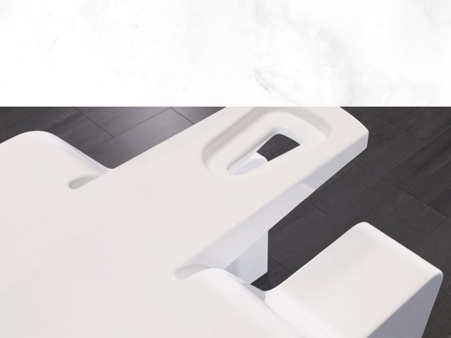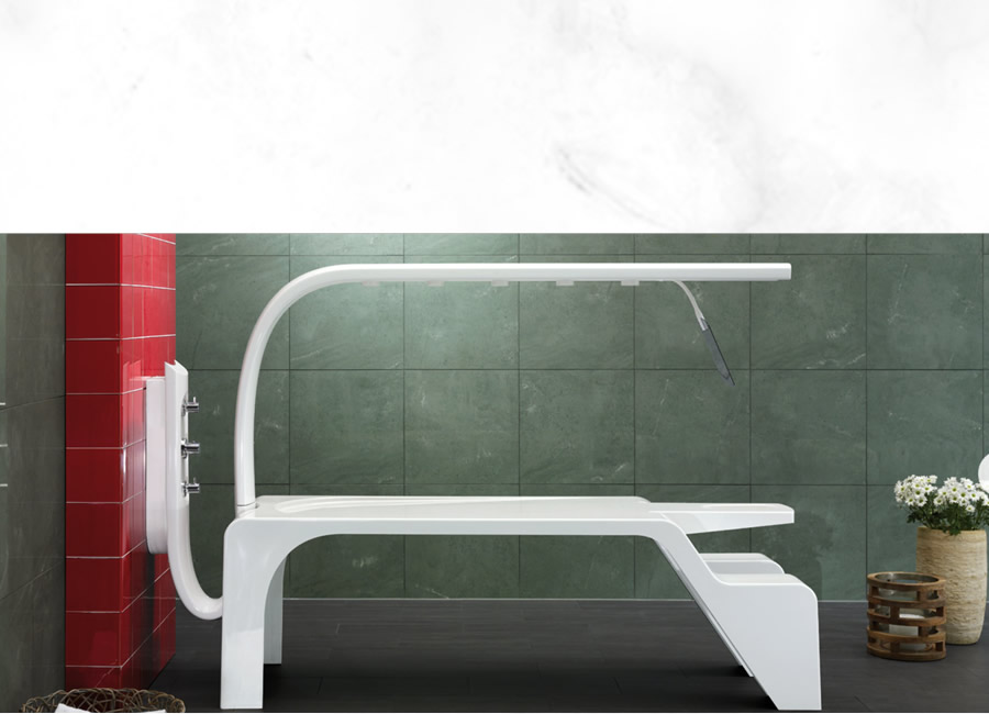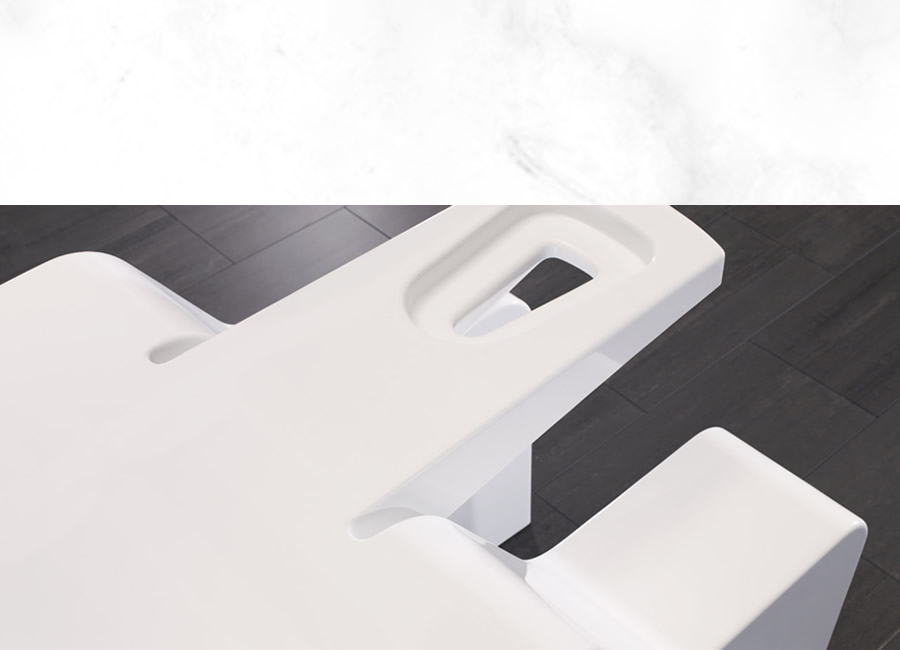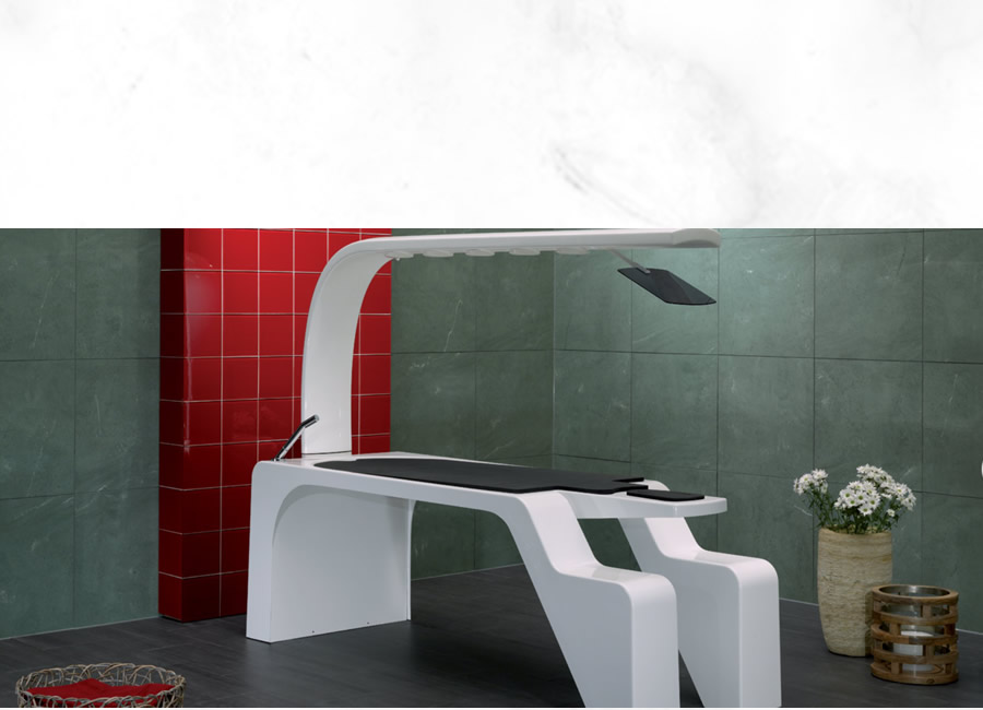 VICHY SUPÉRIEURE is perfectly suited for the requirements of traditional Vichy Shower treatments. Lowered armrests and an opening for the head allow the user to lie very comfortably. The five shower heads can be adjusted individually and switched off separately. Due to their oval shape they are easy to handle even with wet hands. The unobtrusive splash guard for the face can be adjusted as required and removed for cleaning purposes.