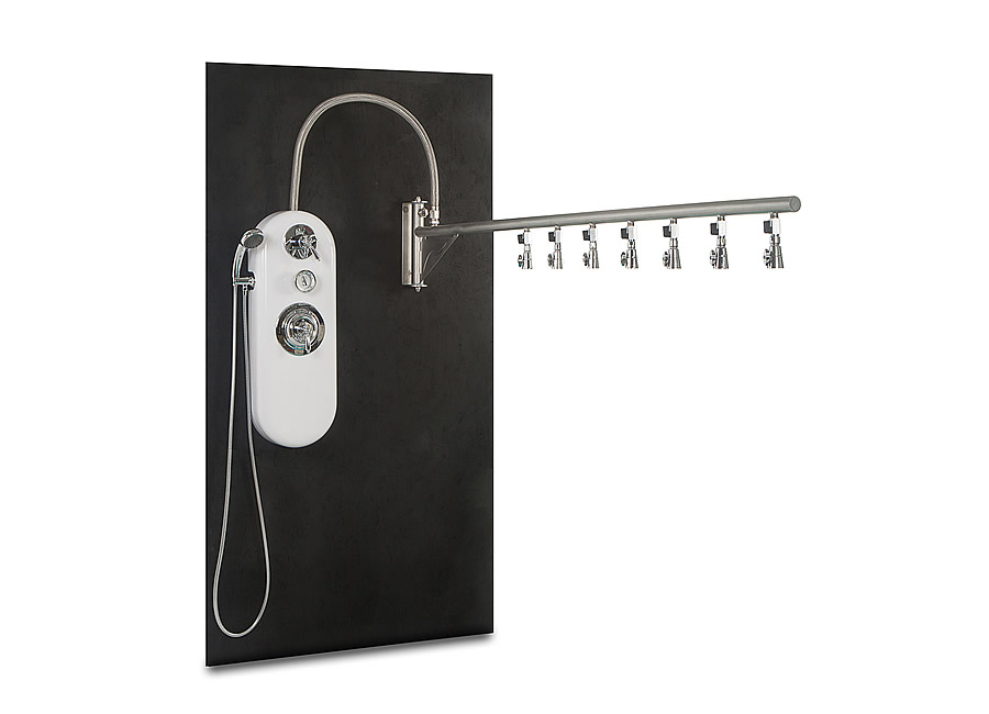 Introducing the New Ditto Vichy Shower. This stylish Vichy Shower can offer a wide variety of treatments in the wet room. The swinging stainless steel rain bar is 84” long allowing for complete coverage of the guest below. The seven spray adjustable showerheads rotate for maximum coverage and have individual volume controls from full spray all the way to positive shut-off.